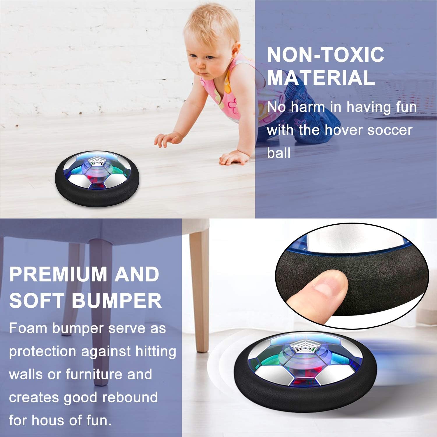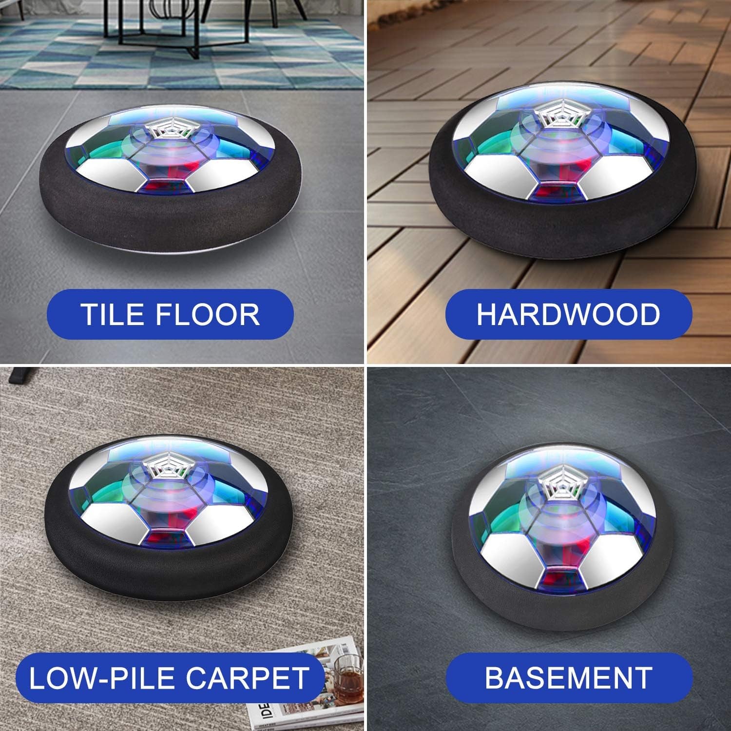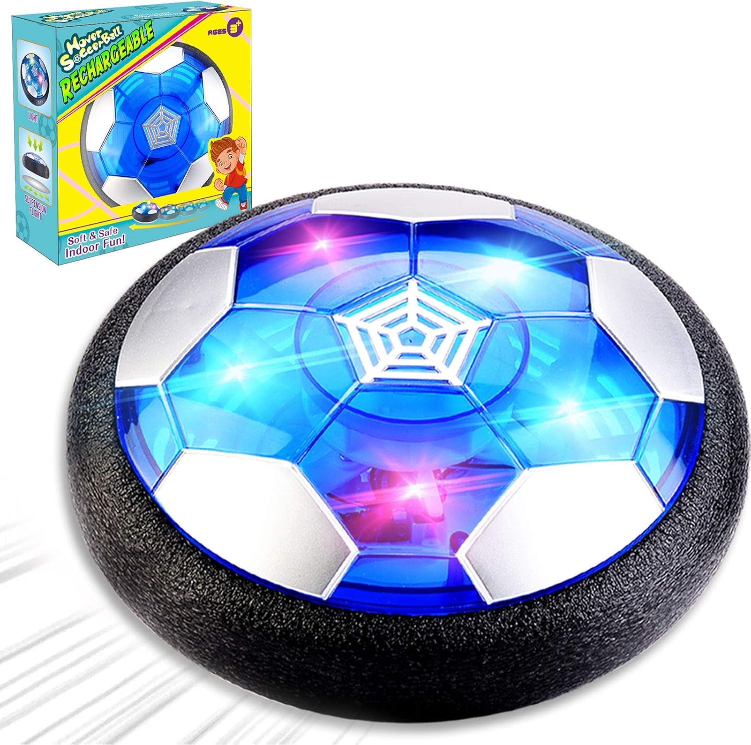 Turn any room into a soccer field! This rechargeable hover soccer ball glides smoothly across any flat surface with LED lights that make playtime even more exciting.